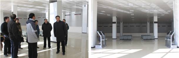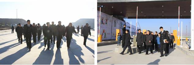 在保稅物流中心卡口上方"青海曹家堡保稅物流中心"以中英文兩種字體呈現,海關標識赫然醒目。王黎明副省長一行在實地查看了1#、2#保稅倉庫、卡口、查驗庫、辦事大廳等設施,并邊走邊聽取物產集團總經理王玉輝關于工程施工進展情況的匯報。
