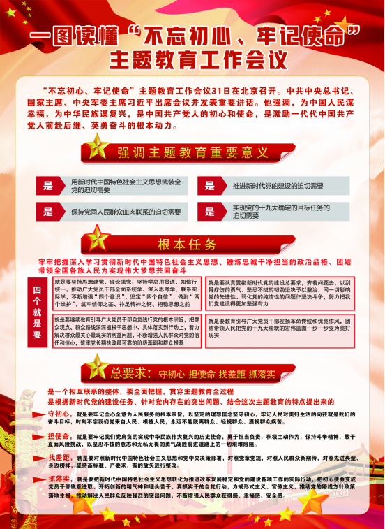 由集團黨委副書記、總經(jīng)理劉玲同志宣讀《集團黨委開展"不忘初心、牢記使命"主題教育實施方案》。集團黨委書記、董事長王玉輝同志作了"不忘初心、牢記使命"主題教育動員講話,對集團系統(tǒng)開展主題教育工作進行了安排部署,要求把主題教育與完成本單位轉型升級、項目建設、生產經(jīng)營等工作任務結合起來,切實把主題教育成果轉化為企業(yè)發(fā)展的強大動力,推動青海物產高質量發(fā)展。省委"不忘初心、牢記使命"主題教育第十二巡回指導組組長任正德同志做了指導講話。充分肯定了集團黨委的前期工作,認為會議準備比較充分,有效統(tǒng)一了干部職工的思想,制定的主題教育《實施方案》操作性強,目標任務具體,動員講話政治站位高,思想認識深,工作思路清晰。同時,結合工作組的職責就落實主題教育各項任務講了六點意見。一是聚焦根本任務;二是把握"十二"字總要求;三是緊扣"五句話"總目標;四是落實"四個貫穿";五是抓實"六項重點"舉措;六是力戒形式主義,嚴禁主題教育走形式、走過場。