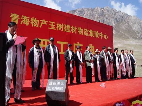 王總在開工儀式上講道:"地震摧毀了美麗的玉樹,但我們要從廢墟中挺立起來,用自己勤勞的雙手,去建設一個更加美麗、更加富饒、更加和諧的社會主義新玉樹。"這是黨和政府的囑托,也是災區人民殷切的期盼。作為省內長期從事生產資料流通的大型國有企業,我司有責任、有義務,發揚一方有難,八方支援,團結互助,共克時艱的精神,積極投身到玉樹災后重建工作中去。我司在中標政府采購的2萬噸鋼材和2.1萬立方米木材的基礎上,再投資2600萬元建設青海物產玉樹建材物流集散中心,我們將在最短的工期內,用科學、綠色的施工方法將建材物流集散中心建成使用,并在未來3年時間內,完成玉樹災后重建所需的包括鋼材、木材、陶瓷建材、裝飾建材等物資的供應配送,為相繼開工的各個建設項目,提供源源不斷的建筑材料物資保障。為建設一個更加美麗、更加富饒、更加和諧的社會主義新玉樹奉獻我們青海物產人的力量。