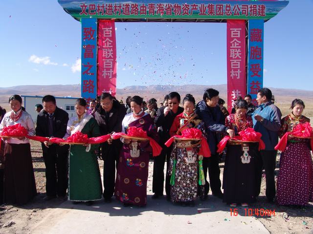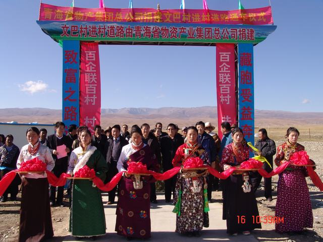 交接儀式上,集團公司總經理王玉輝、共和縣人大常委會主任尕瑪才讓為元者村黨員活動室、科普文化室、醫療衛生室揭牌之后,與黨委書記白家林、紀委書記王仁芬、共和縣委常委、組織部長官卻南見等領導為共和縣黑馬河鄉文巴村進村道路通車剪彩。集團公司黨委書記白家林代表省物產集團向共和縣江西溝鄉提前捐送元者村游牧民定居點工程配套資金100,000元。集團公司紀委書記王仁芬、共和縣委常委、組織部長官卻南見、江西溝鄉元者村村長、文巴村村長分別代表捐建方、受捐方致辭發言。至此,青海物產集團在"百企聯百村"活動中擬投入的1,455,500元,已到位1,255,500元。剩余的200,000元游牧民定居點工程建設項目捐款將根據工程進度分期轉付。